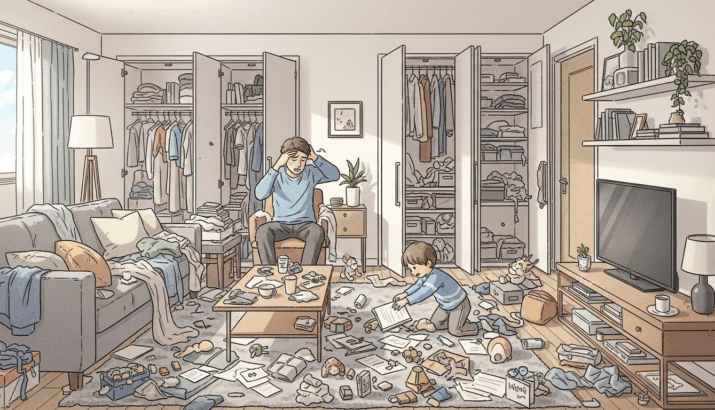 実はこれは不便さだけではなく、心の負担(環境ストレス)にもつながります。視界に雑多なモノが増えるほど注意力は奪われ、家族の小競り合いも起きやすくなる——そんな悪循環を間取りの工夫で断つのがこの記事の目的です。