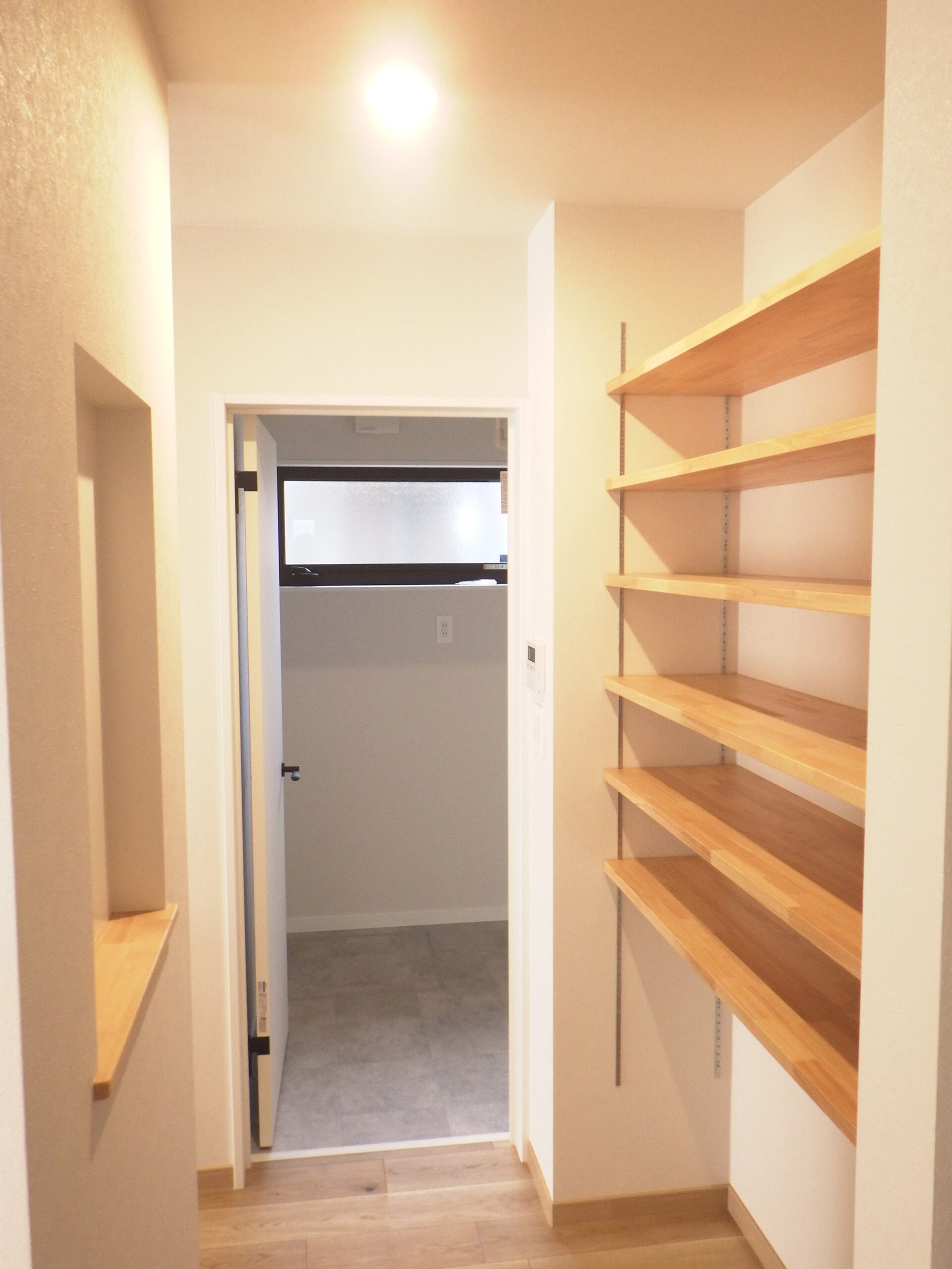 キッチン横の通路に面しておいた可動収納は天井まであり、様々なものを収納できます。