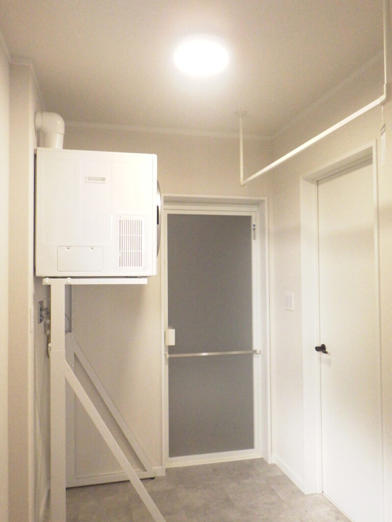 脱衣とランドリーを兼ねたスペース。ガス乾燥機とランドリーパイプを設置して状況に応じて洗濯乾燥が可能。洗濯乾燥から収納の動線をシンプルにし、家事動線を短くしています。